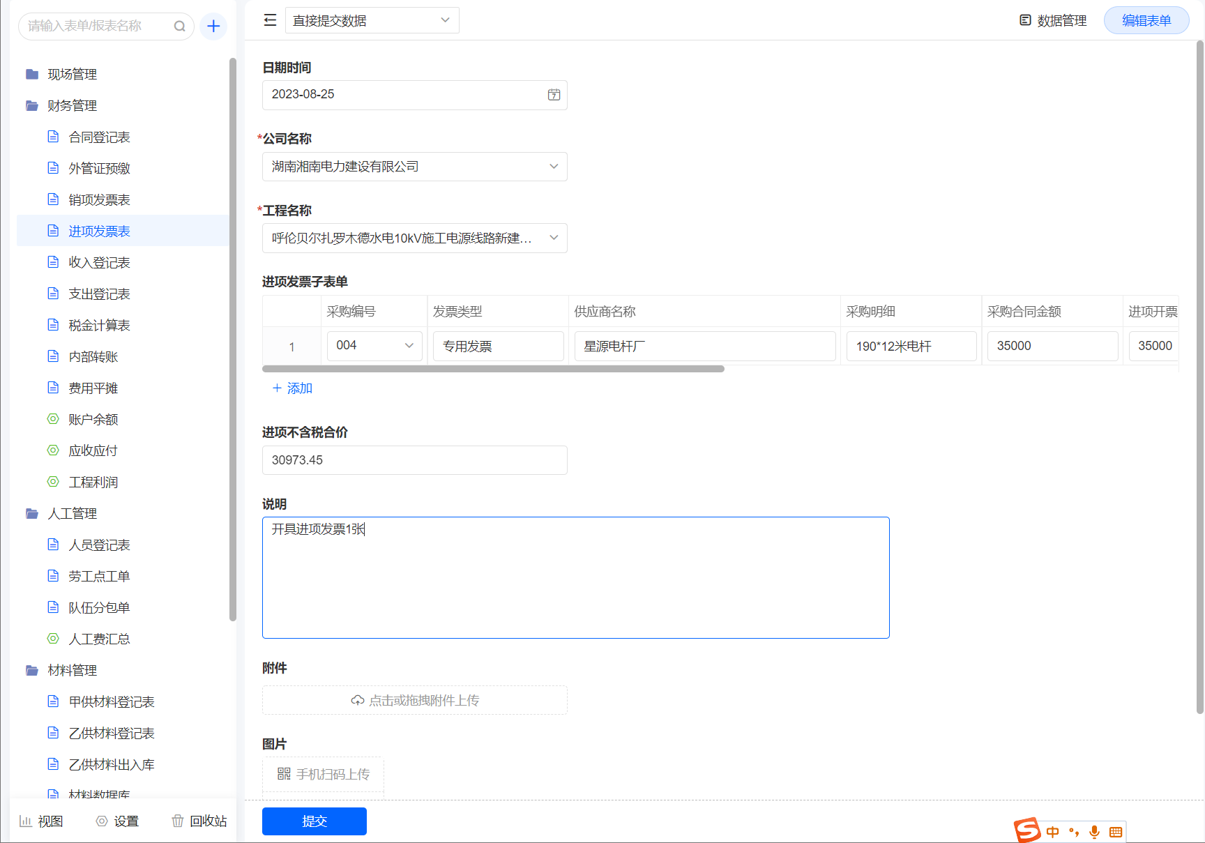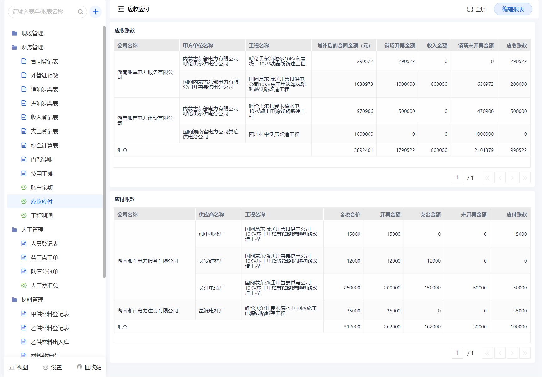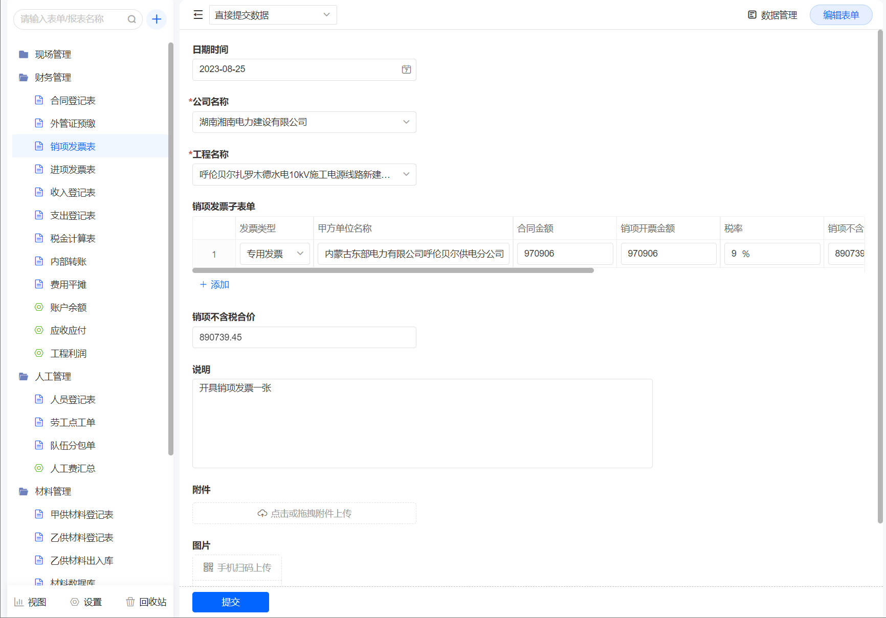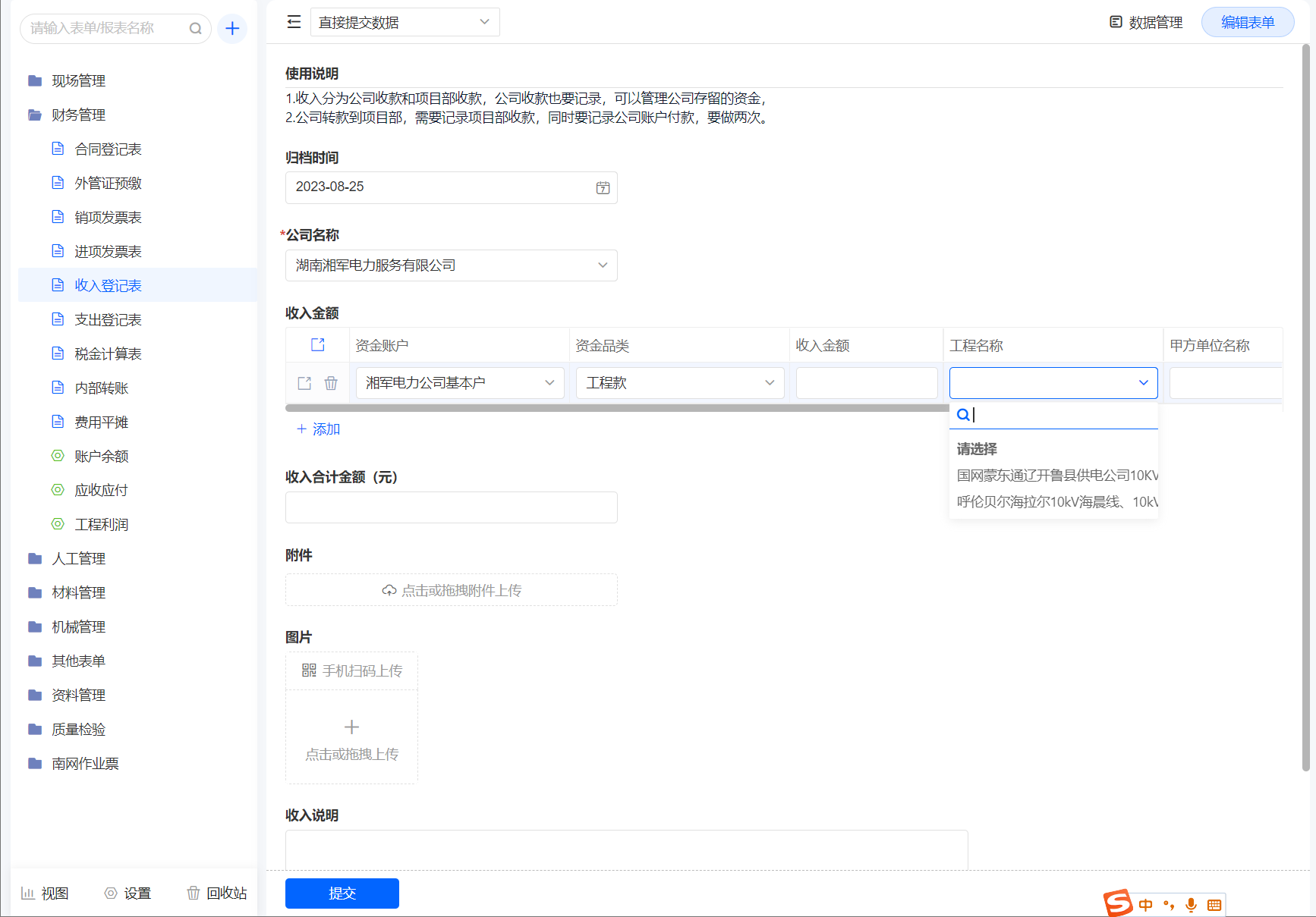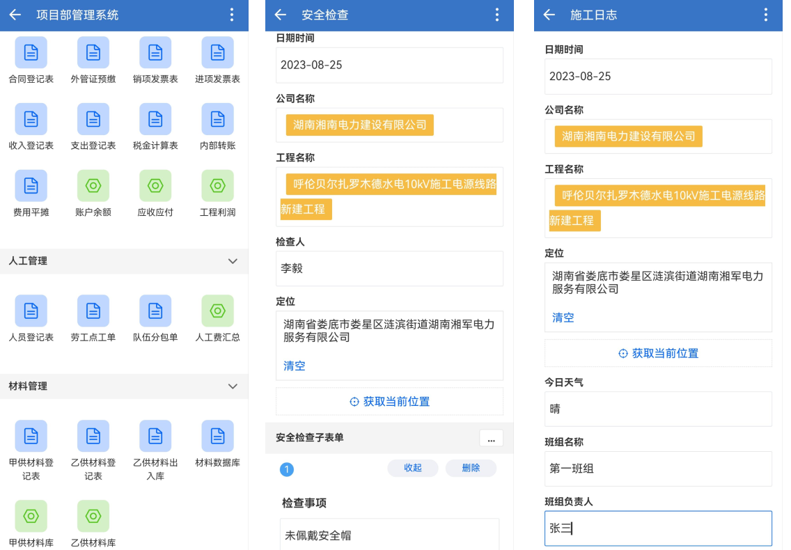 项目管理系统,适用于建筑业项目管理,本应用以电力工程为案例进行设计,主要由现场管理、财务管理、成本管理和资料管理四个大类,如有需要,请联系我们。